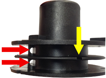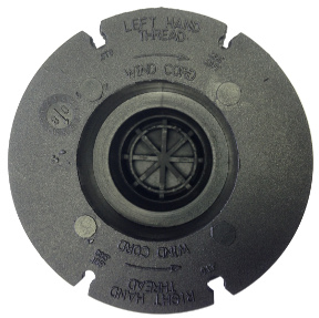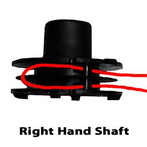 Take the new piece of line and insert one end in each of the holes on the body of the spool following the setup determined on step 4. Pull the line evenly and snap the center loop in the U shaped slit on the middle ring. Wind the line around the spool in the direction indicated by the arrows on the spool: left hand thread is winded clockwise while the right hand thread should be winded counter-clockwise. Keep each section of the line on its own half of the spool (top or bottom). Leave about 6" of line loose.
