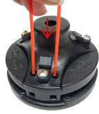 Take a new piece of line and fold it in half. Insert one end in each of the small holes between the line holders. Keep pushing the line until the ends come out of the other side.